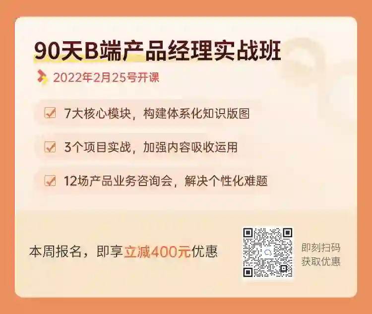 基于此,向你推荐腾讯课堂&起点课堂联合打造了《90天B端产品经理实战班》直播课程,萃取行业头部专家经验,多位BAT大厂10年+经验B端产品专家直播亲授,帮助大家系统掌握B端产品建设的核心方法论,实现专业技能提升。