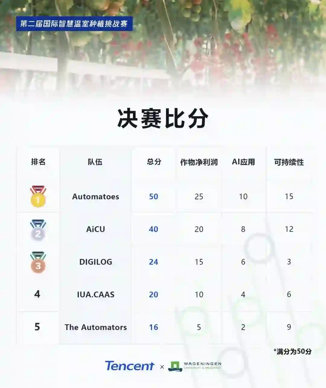 比赛目标是在6个月内竞争选出小番茄的最佳智慧种植方案,并贴近五大目标:产量高、品质好、能耗少、自动化、技术可迁移。评审团最终按三个维度打分,一是作物净利润(占50%,包括产量、品质、价格等指标),二是AI应用(占30%,包括自动化、创新性、功能性、抗干扰鲁棒性、可规模化、可迁移性等指标),三是可持续性(占20%,包括水、肥、电、热和二氧化碳等资源的利用效率)。今年参赛的21支队伍来自26个国家,共200多人(去年15支队伍),我们也看到更多小型公司、独立农人和学生加入,呈现背景多元、百花齐放趋势。