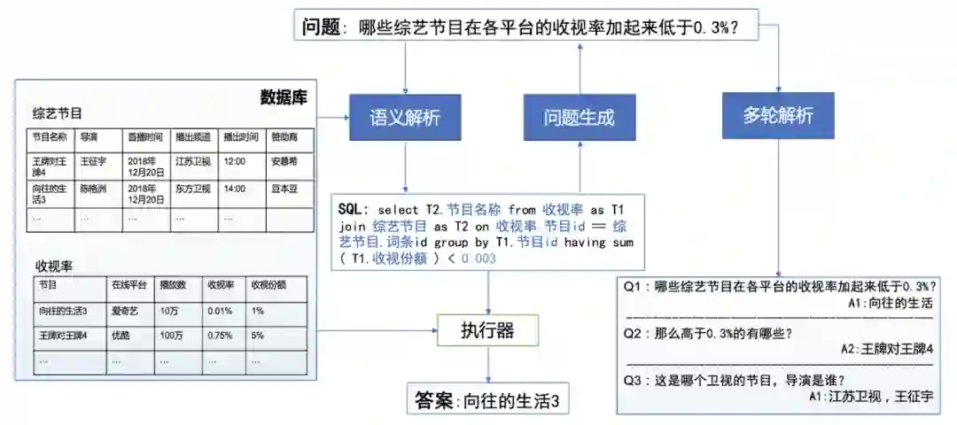 Text2SQL就是为了便捷访问数据库存在的一种技术,具体是指在给定关系型数据库(或表格)的前提下,根据用户的提问生成相应的SQL查询语句。上图给出了一个具体的实例,问题为:哪些综艺节目在各平台的收视率加起来低于0.3%?可以看到该问题对应的SQL语句是比较复杂的,需要同时对2个表格进行查询。