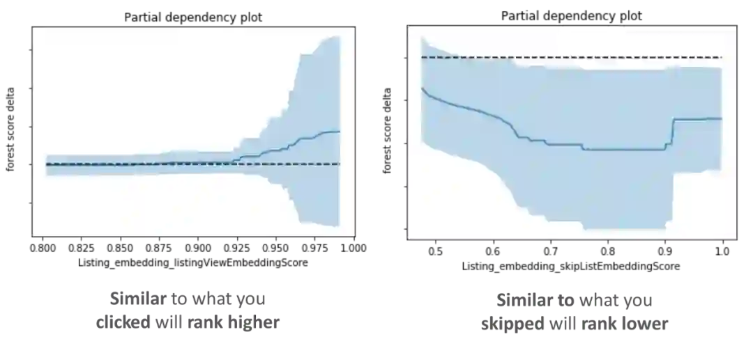 来自部分依赖关系图的观察证实,特征行为符合我们对模型学习的直观预期。此外,新的嵌入特征在模型特征重要度中排名很高,我们的离线测试显示,当嵌入特征添加到模型中时,在保留测试集上的性能指标有了改进。这足以让我们决定进行一项“在线实验”,这项实验非常成功,因此实时个性化嵌入功能在2017年夏天投入生产。