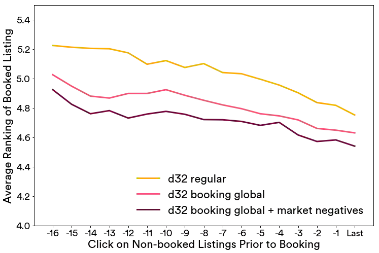 在下图中,我们显示这样一个评估的结果,搜索结果基于在嵌入空间的相似性重新进行排序,预订了的房屋的排序结果序是按照每次预定前的点击数量的平均值来计算得到,最多追溯到预定前的17 次点击。
