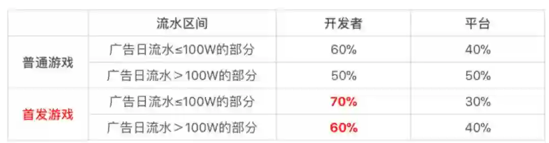 如果选择在抖音平台首发的话,开发者可以获得最高7:3的流量分成(主要是广告),即使不是首发游戏,只要不超过100W的广告日流水也可以与平台进行6:4的流量分成。