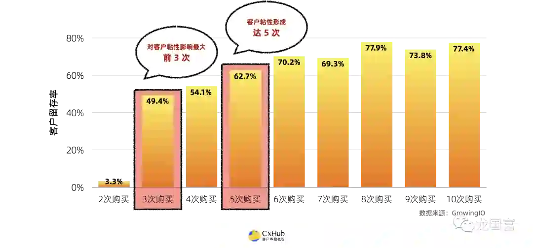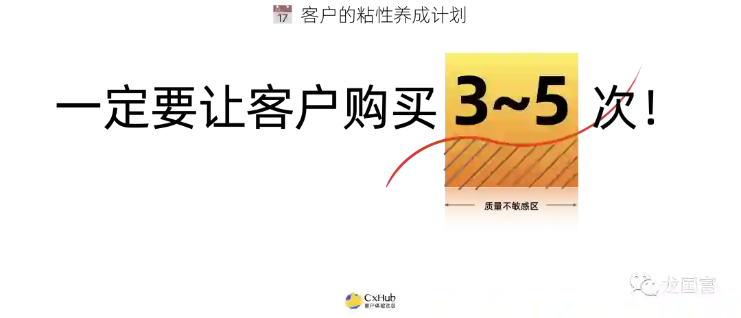 即在第 5 次购买时,客户粘性就会形成。所以,一定要让客户购买 3~5 次。