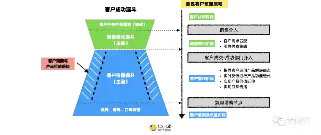 为了应对客户预期的期望,SaaS 平台要想获得客户的满意,那就需要从客户成功的漏斗触发了,在不同的阶段主动介入,在旅程中帮助客户价值提升,以满足预期,提高满意度。