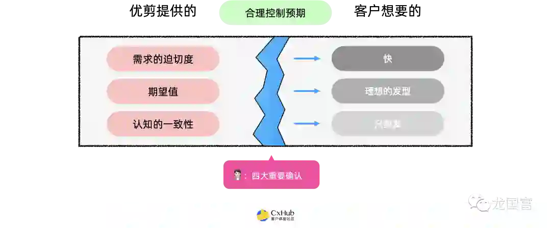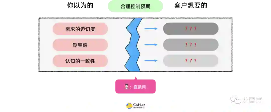 还有这里给大家分享一个小窍门:时刻和客户体验感知保持同步,让客户了解到获取最终交付结果的全过程,以及你们为了满足客户需求所付出的种种努力。这样对于预期的合理控制,也是相当有效的。