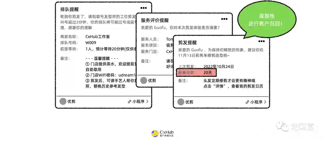 优剪依据这个洞察,在顾客召回的设定上,依据顾客自上次理发起计算 20 天,一条提醒剪发的微信模板消息,就会主动推送到顾客的微信上,让他知道“到时间理发了”。