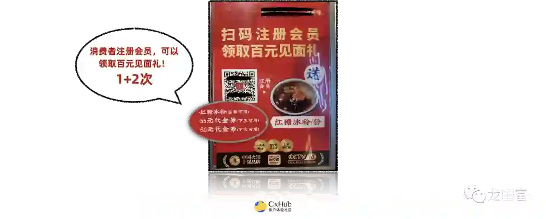 这家餐厅则是以注册会员赠送 2 张代金券的方式~ 消费者下次来吃饭的时候可以使用代金券,如此一来,也可以吸引顾客消费达到 3 次的频次。