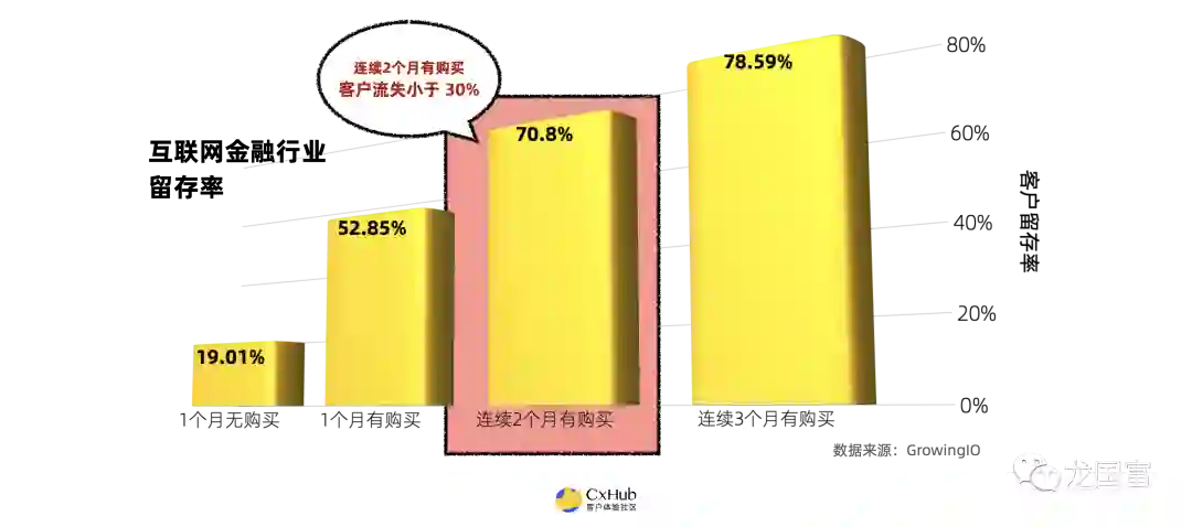 比如,互联网金融行业的留存率,我们可以看到一个月没有购买的客户留存率仅为 19.1%,有一次购买的留存率就可以达到 52.85%。从图表中可以看出,当新客户在连续 2 个月有购买,留存率就会达到 70.8%,这个就是我们要找的客户粘性养成周期观点。