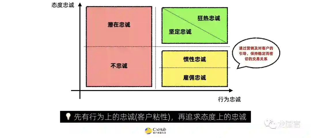 最后,通过客户持续的满意、口碑推荐,客户生命周期的体验管理,达成真正意义上、态度和行为两者兼具的客户忠诚。