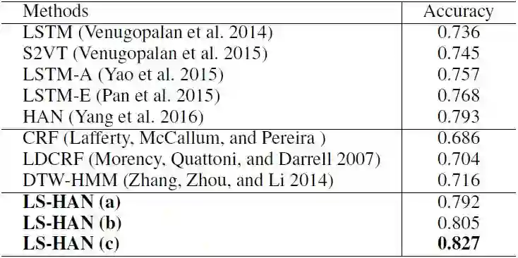 受利用长短期记忆(LSTM)网络进行视频描述生成的启发,研究者使用分层注意力网络(HAN,LSTM 的扩展)绕过时域分割,考虑结构信息和注意力机制。该方案需要向 HAN 馈送整个视频,然后逐词输出完成的句子。但是,HAN 可以根据输入视频和前一个单词来优化生成下一个单词的概率,但忽略了视频和句子之间的关系(Pan et al. 2015)。因此,它会遇到是否稳健的问题。为了解决这个问题,研究者整合了潜在空间(LS,Latent Space)模型,以明确地利用视频和文本句子之间的关系。