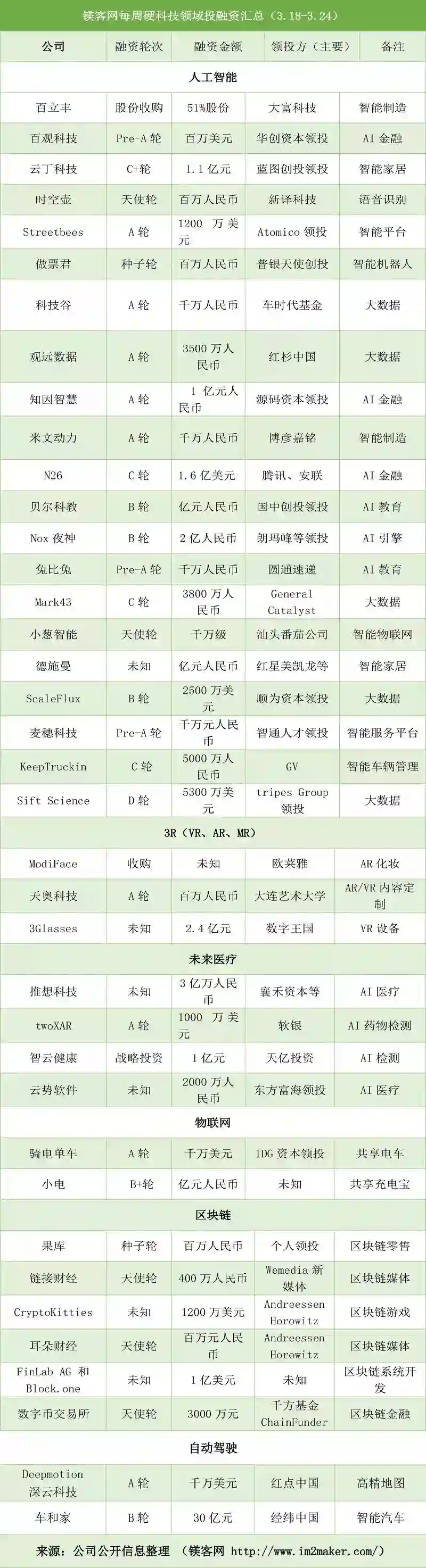 在人工智能领域投资中,AI少儿编程教育引人关注,例如专注于少儿AI编程教育的贝尔科技获得亿元B轮融资。此外,腾讯联合安联资本投资1.6亿美元给德国AI金融银行N26。在3R(AR/VR/MR)领域,3glasses获得了来自数字王国2.4亿元的高额投资,让人不禁思考VR的未来是否又变得明亮起来。