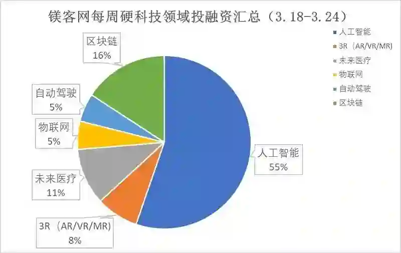 本周硬科技领域投融资事件共38起。其中人工智能领域投资事件数量最多,高达21起,占比57%。3R(AR/VR/MR)领域投资事件有3起,其中收购1起。其次,未来医疗领域的投融资数量有所下降,仅有4起。同时,物联网领域有2起投资,区块链领域6起投资,自动驾驶领域2起投资。