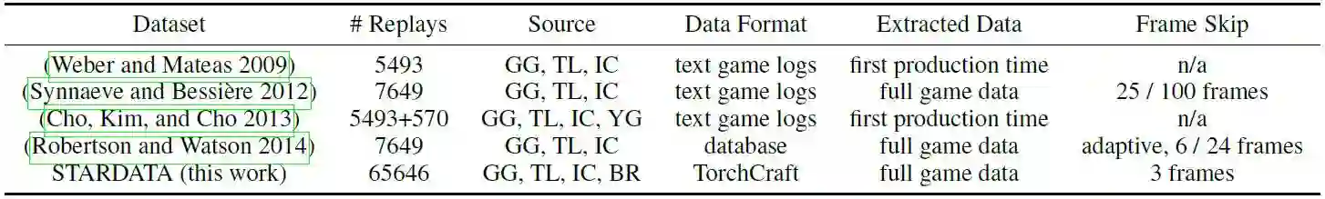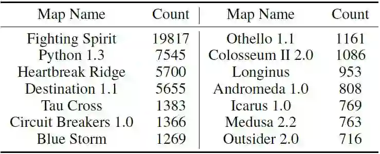 对于数据集中的每一个 replay,完整的游戏状态每 3 帧存储一次(每秒约 8 帧)。这意味着一个人可以使用数据集学习游戏策略从微观到宏观的不同方面,并且满足了普适性需求。当前论文的结构如下。首先,我们概述现有的数据集,它们的主要特征和局限。我们进一步细节性地描述新数据集,它是如何被构建和验证的。接着我们展示一些与新数据集相关的统计数据,并提供一些可在其中发挥作用的实例场景。我们也在数据集中发生战争的地方为单元微观管理任务提供元数据。论文的最后我们就数据集的进一步场景和用例做了讨论。