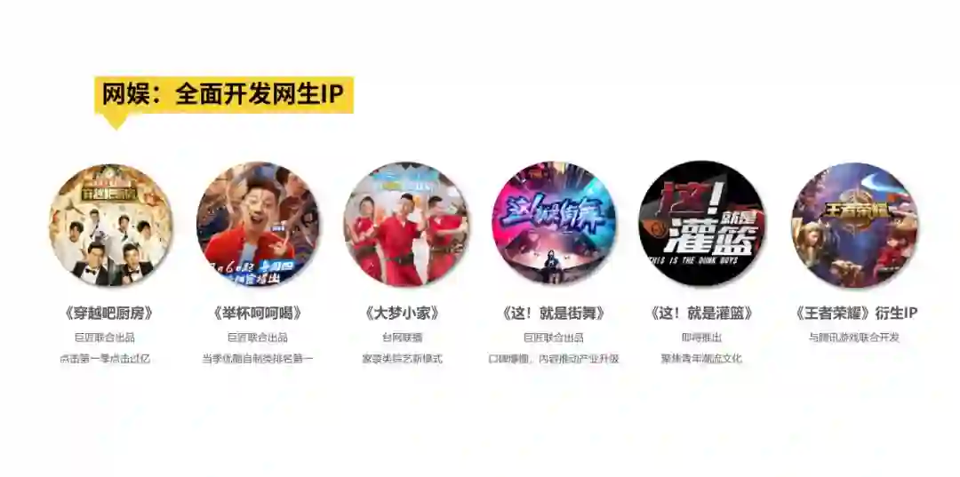 我们在投资方面,更关注的是潮流,比如最近参与到的《这!就是街舞》,还有后续的《这!就是灌篮》。我们致力于每一个网生内容的IP全面开发,每一个栏目都变成一个切入口,通过节目进入行业,然后深入发掘行业链关系,并寻找投资机会。
