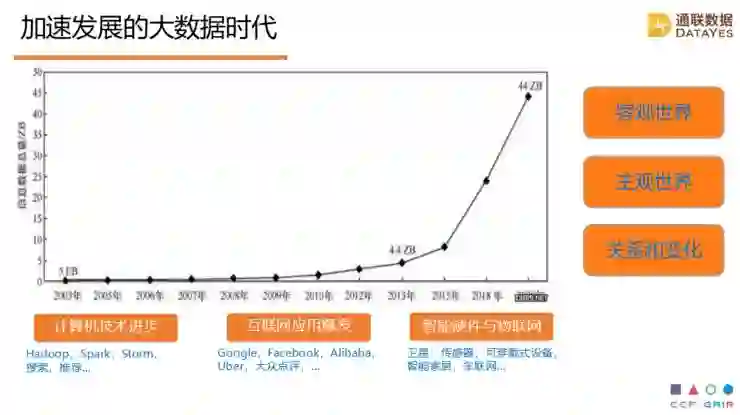 我们生处在一个加速发展的大数据时代,每隔几年数据就要十倍的增长,并且指数提升。大数据背后我们知道有数据采集能力,像智能硬件这方面的进步,也有计算机处理的能力进步,更多的是场景,有了这个技术,有了场景,有了闭环,导致数据像滚雪球一样越来越大,这样的数据对投资来讲可以分成三大类,一种是客观世界的数据,比如说可以通过卫星来观察地球发生什么变化,也可以通过微博去观测人们表达出来的主观想法,从主观世界了解人们的想法,我们也有移动支付,有很多的交易,有些企业里面的工业生产的资料,让我们发现一些关系的变化,比如说钱怎么从一方到另外一方,这三种变化可以让我们对世界观察非常细致彻底,而且非常及时,对投资来说这非常重要。