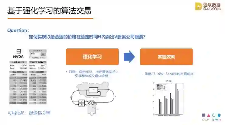 除了在预测营收,预测关键财务数字外,交易上机器学习也能帮助我们很多,像阿尔法狗用的是强化学习技术,面临的场景和交易是一样的,都需要在动态博弈的环境里观察对手的行为,做出自己的判断。在强化学习之前,大家更多的是用传统的,用过去交易量的数据来估计未来的交易量,现在可以利用强化学习,利用更细致的盘口数据来预测,根据研究,这样比传统做法降低27-35%的交易成本。