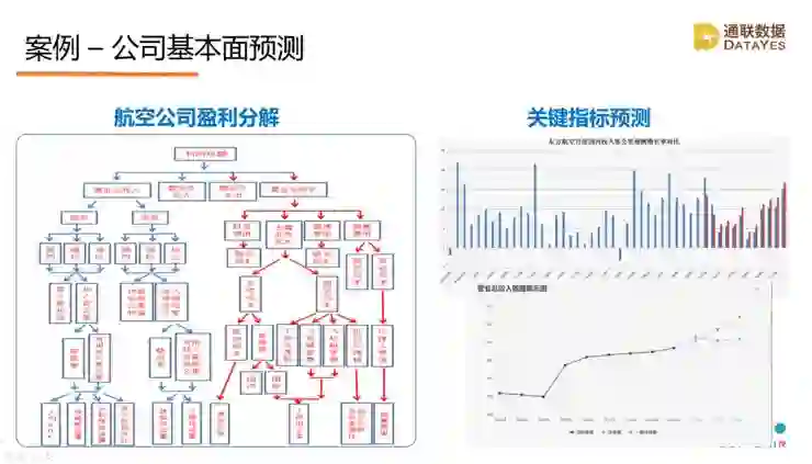 这是对一个公司的预测,利用机器学习数据,可以像研究员一样去分析公司的业务,去预测分析影响公司核心的指标,最终得出营收的预测。这个图我们是以航空公司为例,一步一步按照人的逻辑去分析收入和成本情况,最后会发现一些重要指标,比如说客座率是非常影响公司财务数据的,这样的指标如何预测,其实我们可以用一些方法,利用人均GDP的增长,利用航线数,利用铁路运输情况、机场拥堵度等等数据去预测每个航空公司的客座率,再把这些数据综合起来去预测航空公司未来几个月甚至几年财务的情况。