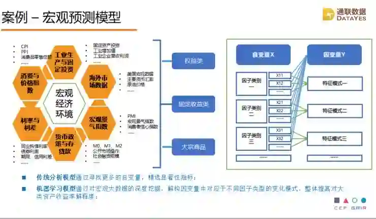这是我们利用深度学习做的宏观预测,我们用了很多的经济变量,比如衡量供给方面、需求方面,衡量人们信息方面,货币方面的指标,结合隐藏层的模型做一个预测,预测目标是市场的主要指数,比如债的指数,大宗商品的指数,股票的指数,基于这样的指数可以做宏观的资产配置和套利。