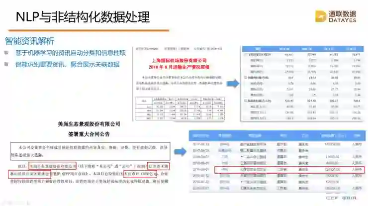 如果我们要做投资,会面对海量数据,比如一个国内投资者每天会面临上千篇的上市公司公告、上万篇的财经和行业的重要信息,还有数以千万计的投资者和社交媒体发布的消息,这些肯定是处理不过来的,这时候就要借助于AI来帮助我们分析。这里分享一个简单例子,怎么样从上市公司发布的公告去提取信息,判断公告是否重要,下面是一篇公司发布的重大合同公告,用自然语言方式描述了合同签订双方和金额等等,通过自然语言提取的技术,能把这里的关键信息,比如说甲方、乙方、合同金额提取出来,提取之后,根据金额和这个企业过去的情况去判断这些信息是否重要,再结合关系图谱去识别这两个关系是否存在潜在关联信息等等,这都是我们做结构化处理的重要帮助。