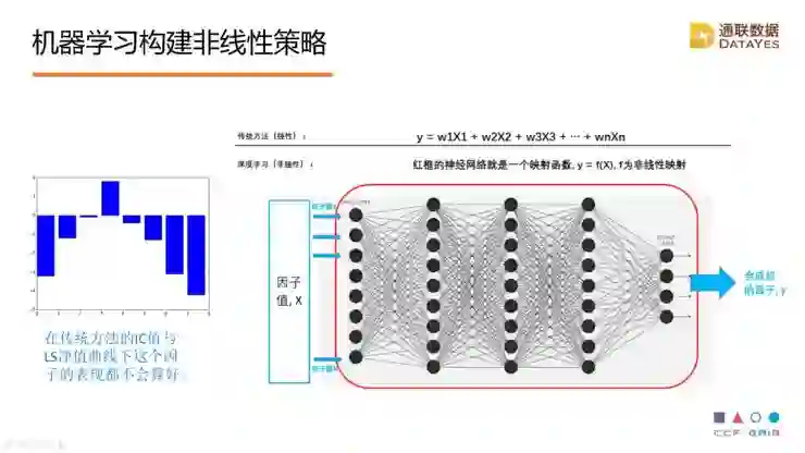刚才提到量化管理已经超过主动管理,成为最主要的投资策略,传统量化是线性模型或者说多因子模型,多因子模型是把一个资产的收益分解成很多因子收益的求和,但是现实生活中太多因子,其实并不是线性关系。比如左边的图是二次关系,用传统基于IC的方法或者做多做空的方法,很难找到有效的因子,机器学习发展给了我们这样的机会,机器学习在对非线性模型的研究上有很多的积累,我们可以利用这样的知识去发掘信息中的非线性关系,帮助我们预测未来资产的收益。