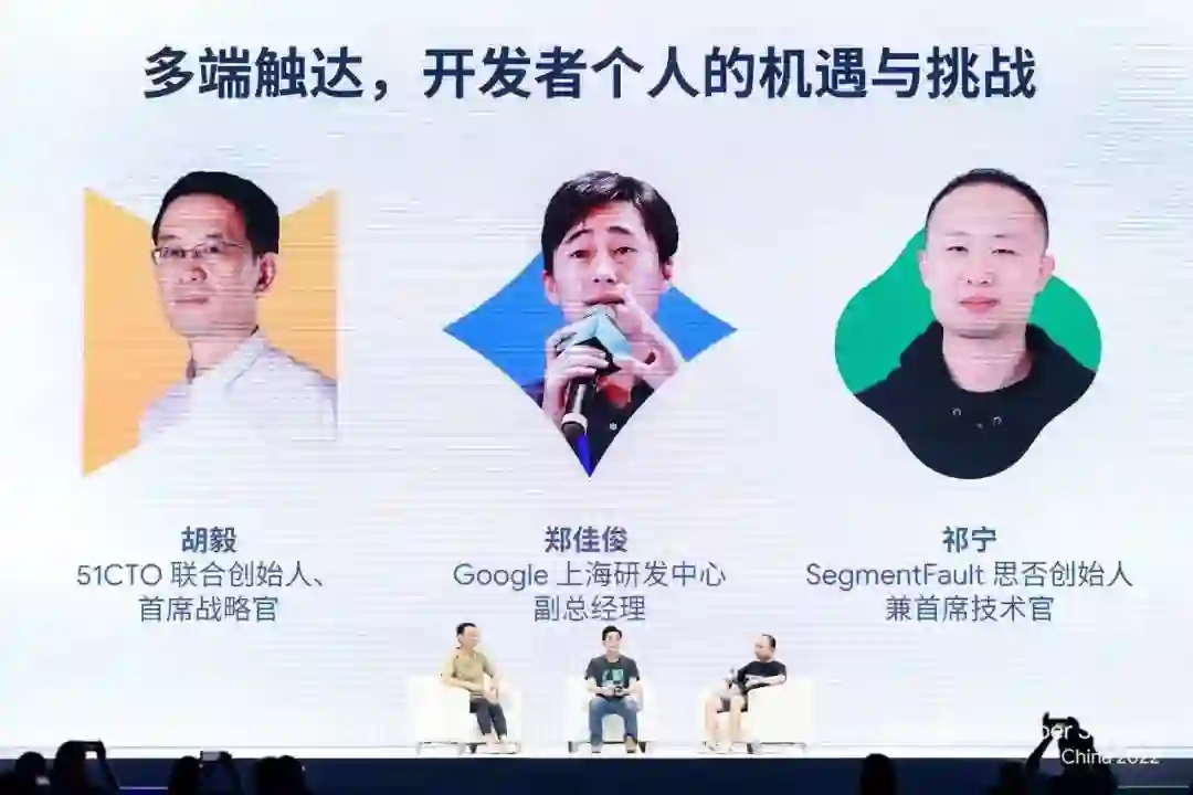来自 51CTO 和思否开发者平台的专家与 Google 上海研发中心副总经理郑佳俊在《多端触达,开发者个人的机遇与挑战》环节中,交流和探讨开发者如何应对全新的技术生态环境,彼此互帮互助共同成长进步。