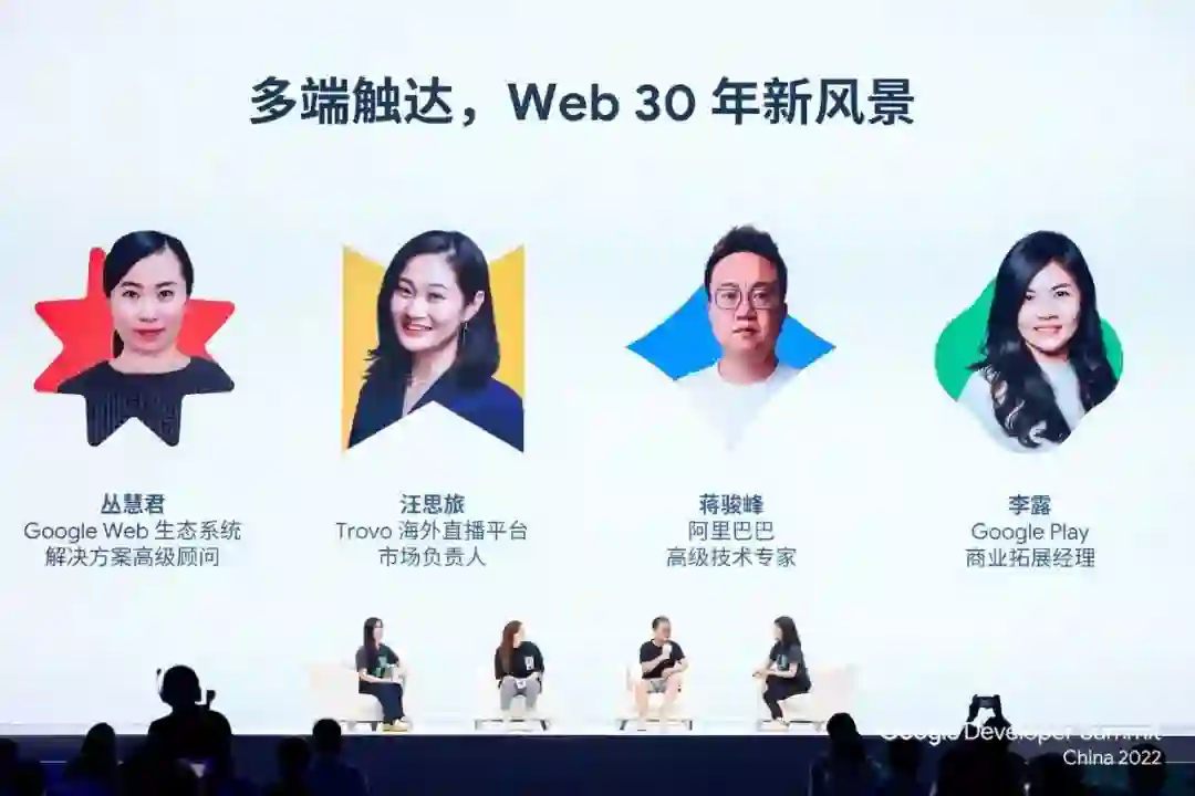 在《多端触达,Web 30 年新风景》的环节中,阿里巴巴高级技术专家蒋骏峰、 Trovo 海外直播平台市场负责人汪思旅、 Google Play 商业拓展经理李露和 Google Web 生态系统解决方案高级顾问丛慧君,立足各自行业实践经验,一起探讨了“多端触达”对 Web 生态的多重意义。
