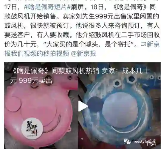 比如大家最近比较熟悉的刷屏短片《啥是佩奇》,有人就开始卖二手鼓风机的,还有趁热卖小猪佩奇的3D打印周边的