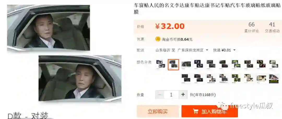 在追影视热点上,淘宝大神的脑洞我是服气的:《速度与激情》火了,有人出范·迪塞尔车窗贴;《人民的名义》火了,又有人出了达康书记车贴,居然还卖了上千单(吓得瓜叔都坐地上了)