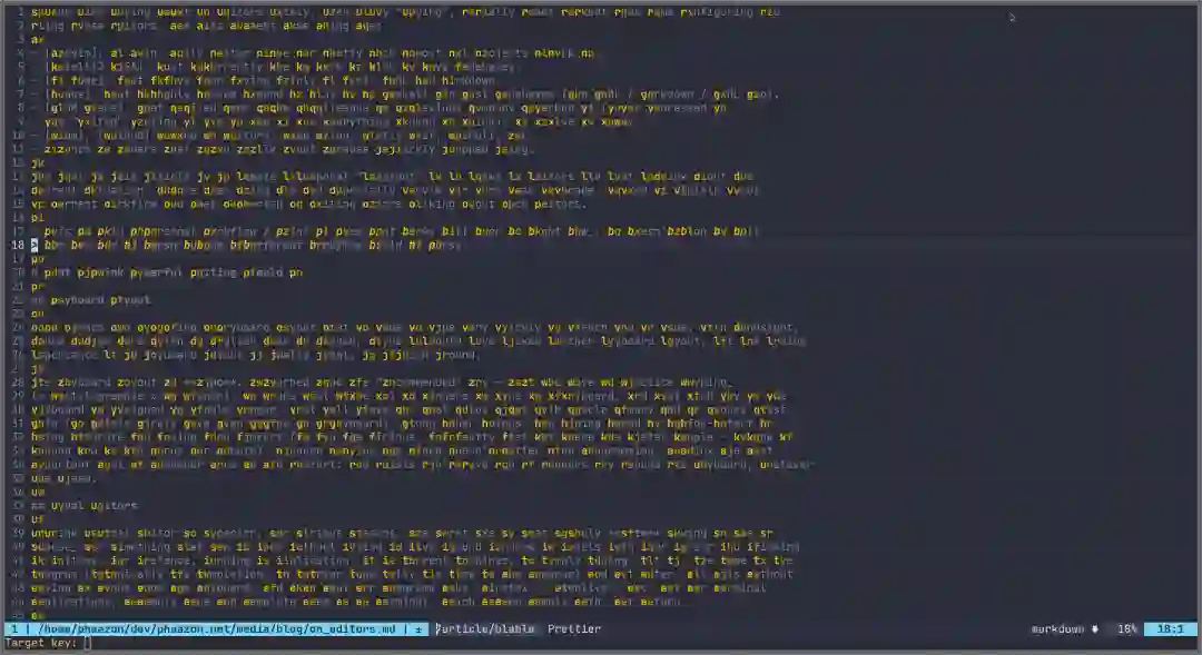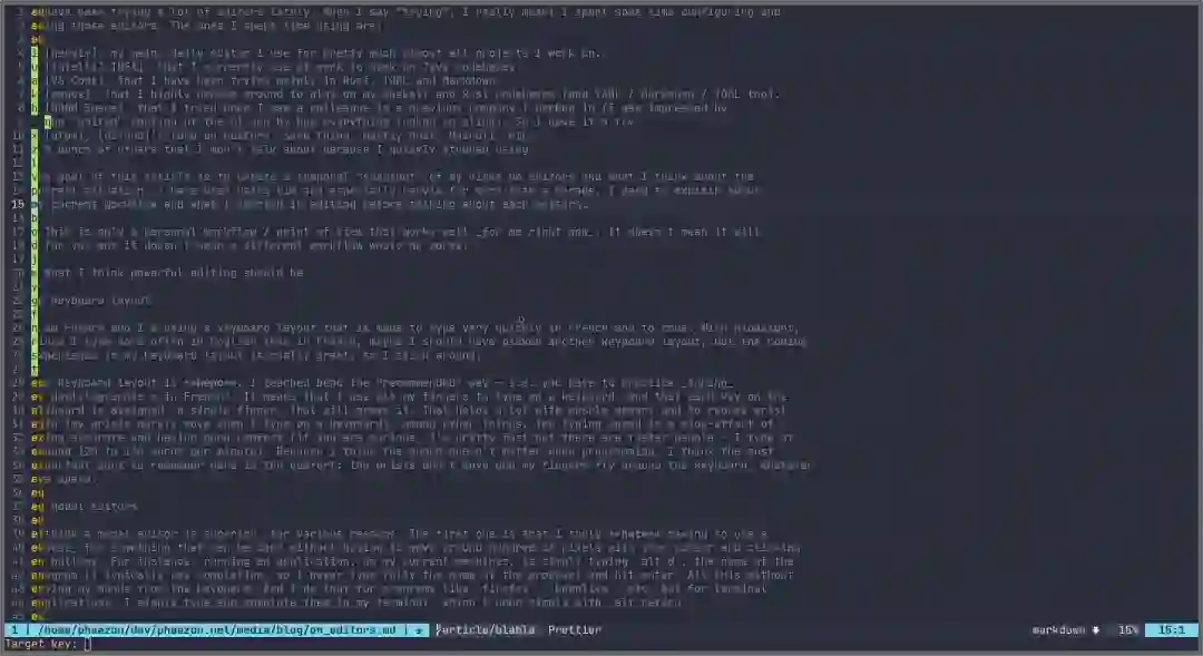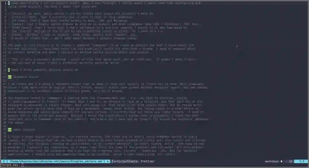 本文主要谈论个人对这些编辑器和该领域现状的看法(不喜勿喷)。我使用 vim,尤其是 neovim 已有十多年。首先,我会解释一下自己目前的工作流程、我对编辑器看重哪些方面。当然,文章仅是一家之言,不代表其他人的情况。