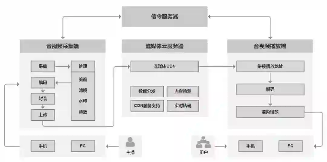 一个直播功能通用的基础架构涉及三个部分,即音视频采集端、云服务端和音视频播放端。
