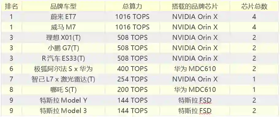 2022高级辅助驾驶车辆算力排行 T为根据公开消息推测