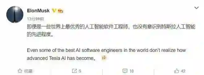 2022年3月6日,特斯拉CEO马斯克发了一条微博:“即便是一些世界上最优秀的人工智能软件工程师,也没有意识到特斯拉人工智能的先进程度。”