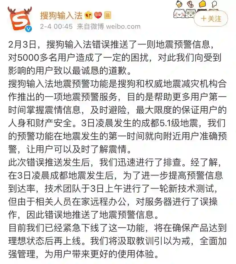 搜狗输入法误推送「12级地震」,官方称都是远程办公惹的祸|最前线