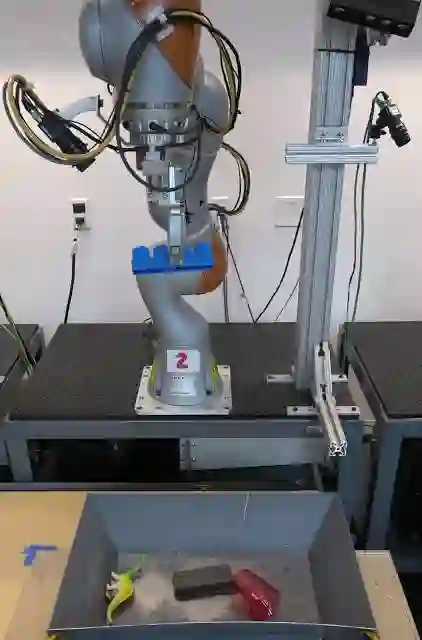 在我们的语义抓取实验设置中,机器臂的任务是抓取用户指定语义类别的物体(如乐高玩具)。