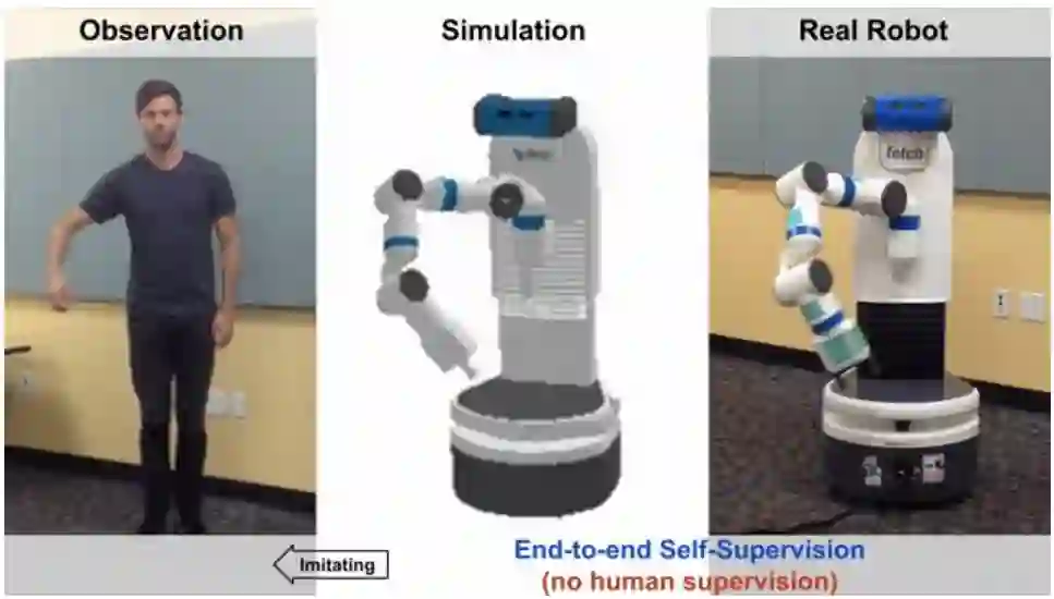 以姿态模仿任务为例,表征的不同维度也许编码一个人类或机器人身体的不同关节。我们没有手动定义人与机器人关节之间的映射(由于生理差异这首先是含糊不清的),而是让机器人以端到端的形式学习模仿。当我们的模型同时在人与机器人的观察中被训练,即使没有提供对应关系,它也自然地会发现两者的这种关系。因此我们无须给出人与机器人之间的对应就获得了模仿人类姿态的机器人。