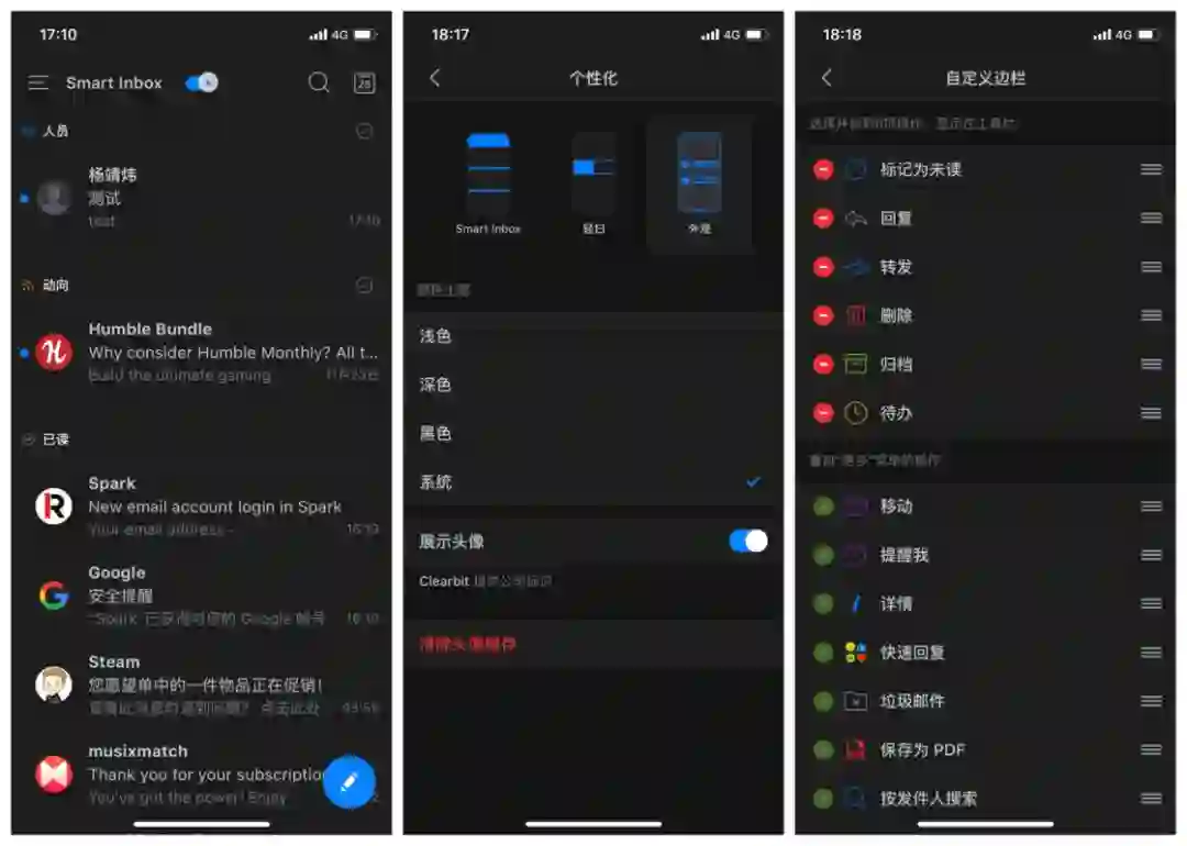 上周,邮件应用 Spark 更新 2.5 版本,带来了深色模式的同时,还更新了应用的整体设计。在「外观」设置项中,应用还增加了邮件头像的展示功能,开启后发件人左侧会显示头像,方便你更快速地进行辨认。Spark 使用的头像素材由