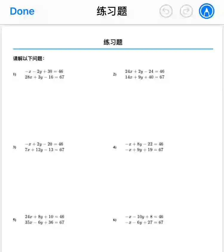 除此之外,微软数学还会在你每次查询题目后为你提供一些同类的练习题。应用会为你自动生成一个 PDF 文件,你可以打印出来,或者直接在 iPad 上用 Apple Pencil 作答。这些题目可以帮助学生反复练习,熟能生巧。不过习题并没有附答案,如果你想要获取详细步骤,还得用微软数学再次识别,稍嫌麻烦。