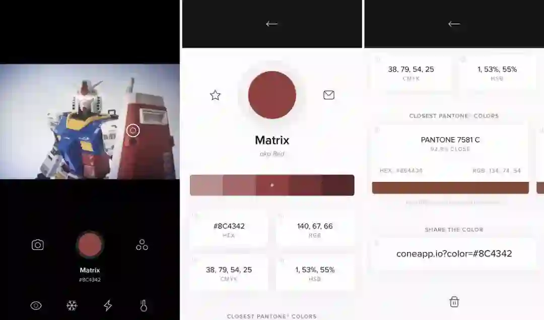 Cone 算得上是一款比较老的应用了,光是 App Store 上的版本记录,最早都能追溯到两年前。最近,它又进行了小幅度的更新,支持了更多色彩。Cone 最大的特点就是它对 Pantone 色卡的支持,Pantone 色卡又称国际标准色卡,在色彩领域有相当高的权威性。在同类应用往往只能提供 HEX 代码等硬性数据的时候,Cone 可以给出当前色彩在 Pantone 色卡上的位置和名称。