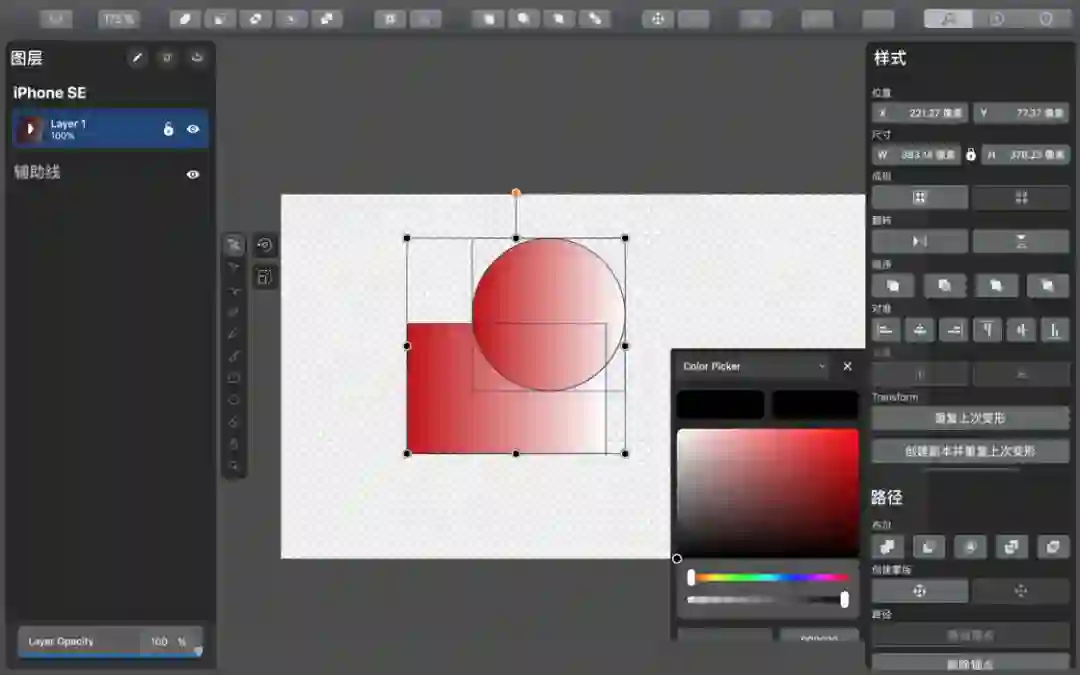 和旗下的 iOS /iPad OS 版类似,Vectornator for Mac 在界面上并没有太多的变化,同样注重的是初级使用者如何入门,左侧是图层,工作则放在左中位置,而属性或者功能调整则放在了右侧,这样的设计对于习惯于 Sketch 的用户而言非常容易理解使用,即便是初级用户也可以很快使用。