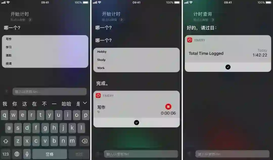 设置好快捷指令后,你只要对 Siri 说出关键词,随后回答几个问题就能快速开启计时器。整个过程不需要跳转至应用。Timery 在「输出」方面的优化则体现在数据汇报上,你可以直接询问 Siri 来获取 Timery 已记录的数据,支持特定计时器、项目或是总时长。