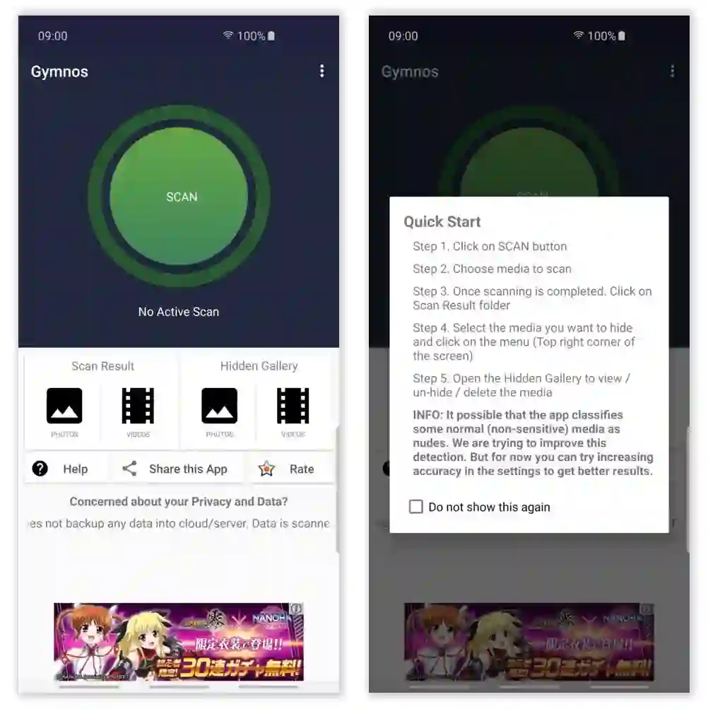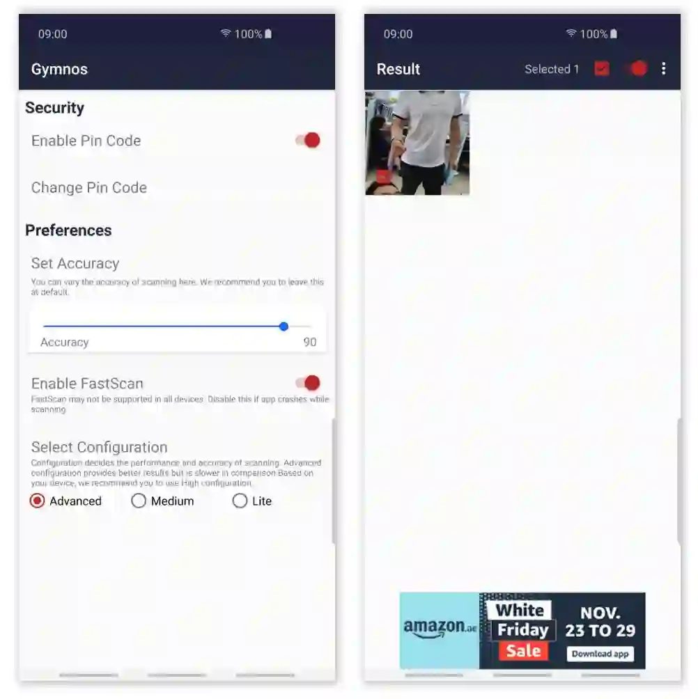 Nude 在 App 内将媒体区分为图片和视频两类,支持 PIN 码和指纹解锁。经过实测,在保持扫描精度为默认的 78% 时,Nude 会包含较多的自拍和常规媒体文件,想要获得比较合理的扫描效果,建议在设置中将「Accuracy」拉到 90% 并保持「Select Configuratiom」选项为「Advanced」,此时扫描结果已经剔除了大多数自拍,仅包含一张含有裸露手臂的图片。如果手机性能较低,可以选择「Medium」,但不建议选择「Lite」,否则虽然会减少手机负载,但改类型算法更容易漏掉真正需要隐藏的内容。