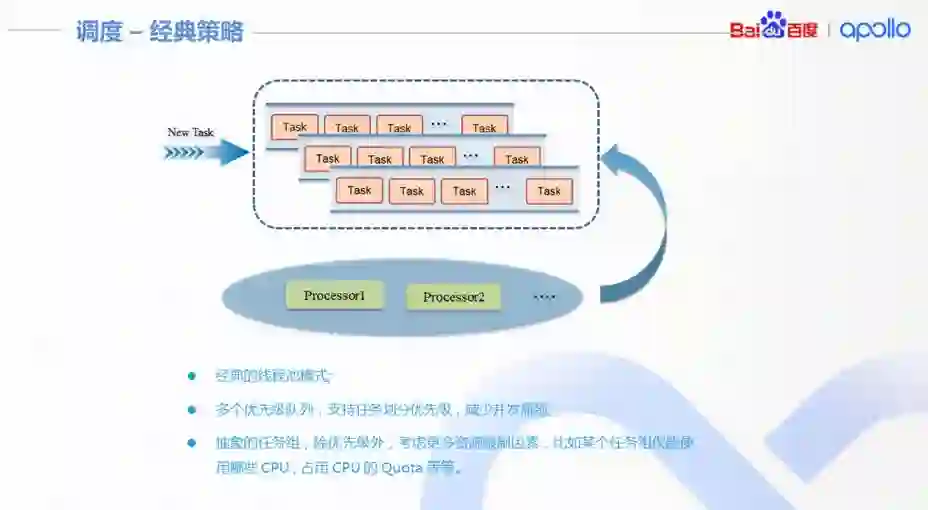 任务编排策略,不仅需要对业务逻辑的深度理解,也需要结合计算机的算力等综合考虑。因此,Cyber RT 也提供了类似经典线程池模式的调度算法,这种模式几乎不存在配置的代价。对此,Cyber RT 也做了一些改进,比如为了减小锁的瓶颈,任务是多队列的。任务队列也支持优先级,后续还会支持分组,通过组控制算法对资源的使用。