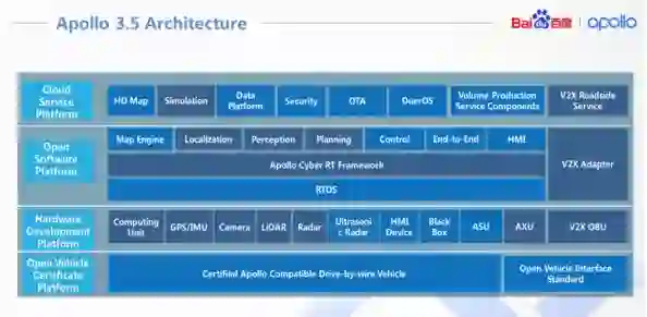 最新发布的 Apollo 3.5 总体架构从上到下仍分为四层,最底层为车辆平台,自动驾驶汽车需要对车辆进行线控改造,使得车载大脑可以通过电信号来控制车辆的执行器;往上一层是硬件平台,包括计算单元、传感器以及 V2X 相关接收设备等。再上一层是软件平台,主要包括操作系统、中间件、算法模块等。最顶层的是云端服务,主要包括地图、OTA 服务升级、数据平台、语音交互等方面。