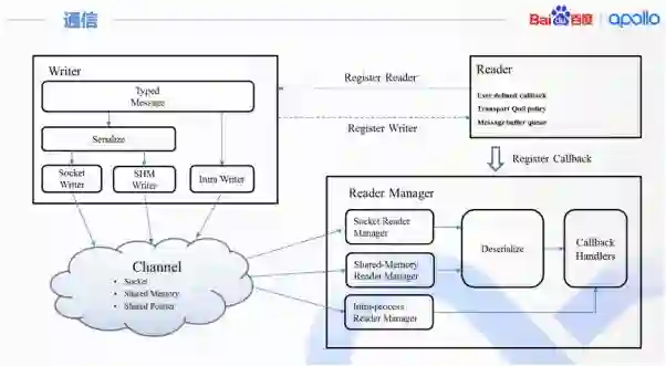 实际部署中,也存在着比如某个工具需要运行在独立的进程,安全系统部署在另外的节点。因此,Cyber RT 也支持跨进程、跨机通信。上层业务逻辑无需关心,通信层会根据算法模块的部署,自动选择相应通信机制。
