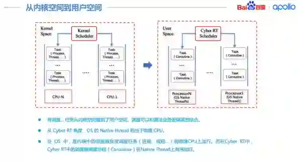 ROS 的主要挑战之一是没有调度,为了解决 ROS 遇到的问题,Cyber RT 的核心设计将调度、任务从内核空间搬到了用户空间。调度可以和算法业务逻辑紧密结合。