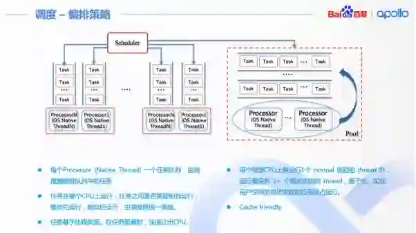 任务编排策略是 Cyber RT 开源的主要策略之一。每个 Processor (Native Thread) 一个任务队列,由调度器编排队列中的任务。任务在哪个 CPU 上运行?任务之间是否需要相邻运行?哪些先运行?哪些后运行?都由调度器统一调度,任务基于协程实现。在任务阻塞时,快速让出 CPU。