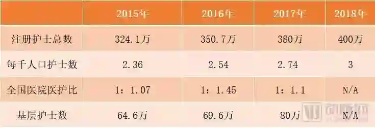 焦雅辉透露,2018年底,全国注册护士总数超过400万,每千人口护士数达到3人;2017年底,我国注册护士总数超过380万人,每千人口护士数2.74。