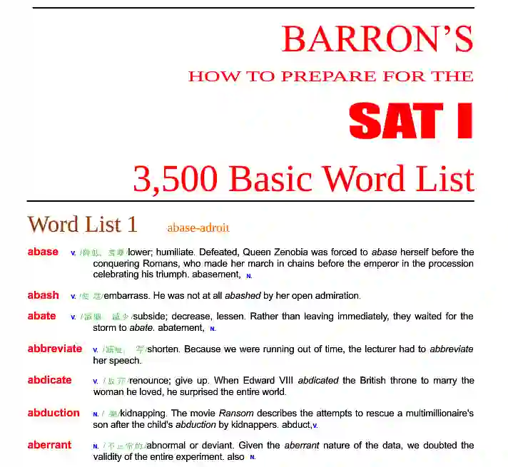 英语:SAT 巴郎 3500 词汇。这是我背的第一本英英词汇。尽管最后没有去考SAT,但是对于我的英语从中级到高级的提高是至关重要的。由于是 SAT 考试词汇,所以基本是美国高中毕业生的水平,掌握之后能够应付大多数杂志、报纸、原版书,以及原版教材。而且这个词汇表之后还有一些近、反义词,可以用来举一反三、词汇扩充,对没有考试需求的朋友也是不错的扩充词汇的选择。
