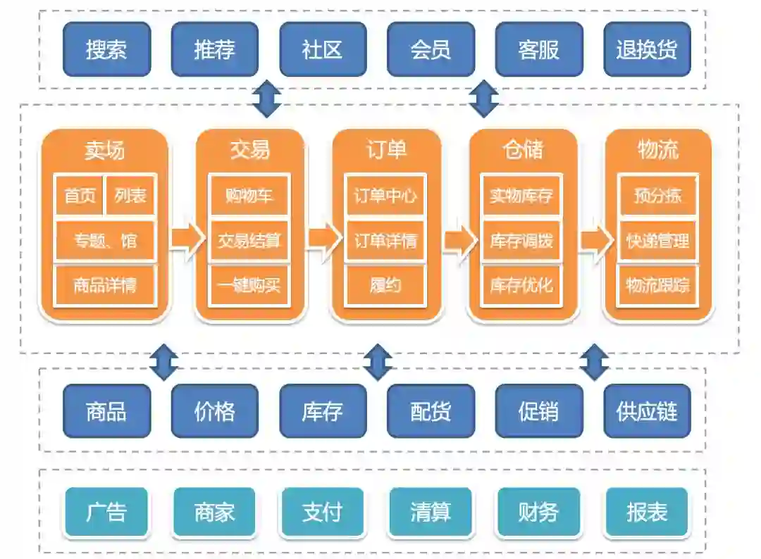 以电商行业为例,电商系统在应用系统层面大致可划分为卖场、交易、订单、仓储、物流等主流程系统,搜索、推荐、社区、会员、客服、退换货等面向用户的前端系统,商品、价格、库存、配货、促销、供应链等面向后台员工的后端系统,以及广告、商家、支付、清算、财务、报表等面向合作伙伴的辅助系统,每个应用系统又会划分为很多子系统。一个粗略的电商系统业务架构如图1-1所示。