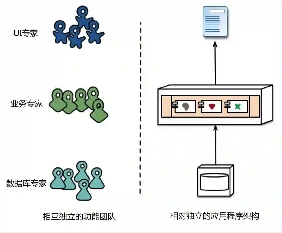 采用微服务架构风格的团队将围绕业务组织团队,而不是围绕技术组织团队,这一点和DevOps有异曲同工之妙。实施微服务前的组织结构如图1-6所示,对于集中式架构而言,拆分大型应用通常需要在技术层面上设立UI团队、后端开发团队、数据库团队。在这种团队划分方式下,即使进行简单更改也会导致协作团队垮掉。
